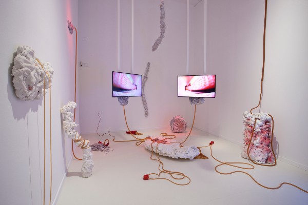 A su lado podemos apreciar la obra de Lucía Bayón (Madrid, 1994), I, Stubborness. Una instalación escultórica que nace del uso de la máquina industrial Hollander que se inventa en el siglo XVII para acelerar la producción de papel y, a día de hoy, se utiliza en las fábricas textiles. Consiste en una máquina que, con una serie de cuchillas y un ciclo de agua, destruye el papel o el algodón. A partir de esa pulpa genero piezas que tienen la idea de querer mantener ese líquido o material que no tiene forma cuando no está en su carácter más puro, pero que a través de moldes generan ese rastro de vasijas, explica la artista.