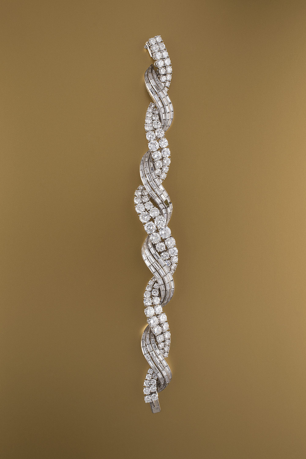 Y de pendientes a brazaletes, llegamos a la joya de la corona de esta puja: el lote 144. Se trata de un brazalete de los años 50 formado por bandas entrelazadas de oro blanco decoradas con ciento treinta y siete diamantes talla baguette montados en boquillas y noventa y un brillantes engastados en garras de cuatro puntas. Una pieza que también luce contrastes franceses y tiene un precio de salida de 30.000 .