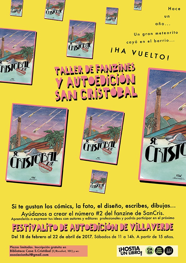 De todos modos, es importante señalar que tanto en el Taller de Autoedición como en el FAV están invitadas todas las personas que no sean del barrio y no sólo quieran acercarse al mundo del fanzine sino que quieran conocer las actividades de Casa San Cristóbal. y, a través de ellas, la vibrante vida de esta comunidad. Las plazas son limitadas. Podéis inscribiros de forma gratuita en Biblioteca Casa San Cristóbal (C/ Rocafort, 101) y en asociacionhul@gmail.com.